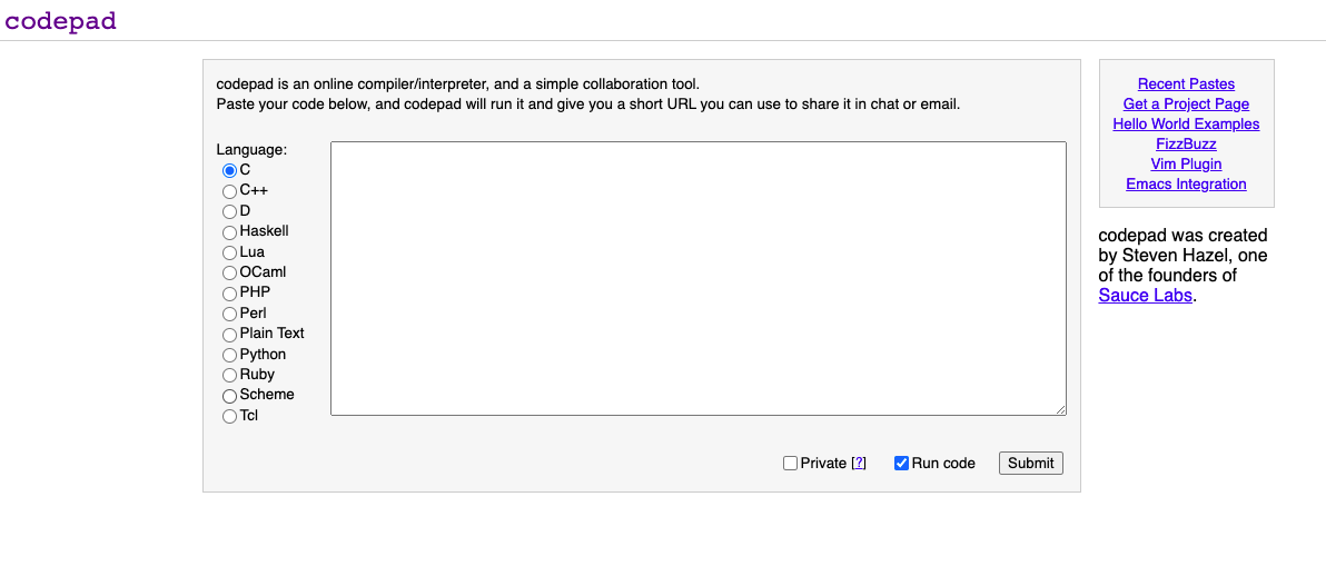 Принцип работы Codepad простой: в текстовое поле сайта нужно вставить сгенерированный ранее код и нажать на кнопку Submit. Утилита в ответ отправит вывод (результат работы) команды. Потом можно оставить комментарий под написанным кодом и сгенерировать постоянную ссылку для взаимодействия с другими программистами.