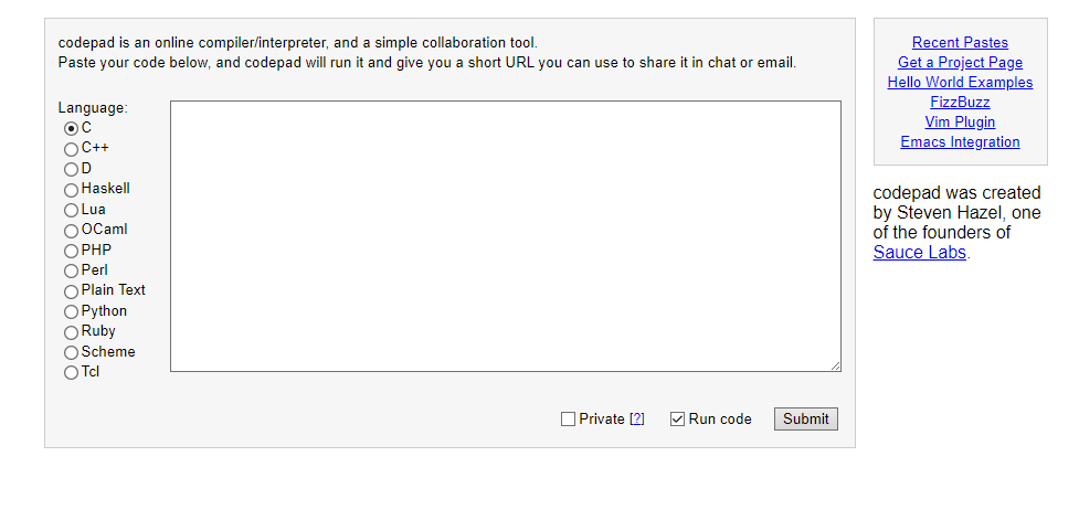 CodePad — минималистичный сервис, в котором можно хранить код, делиться им и запускать с последующим выводом результатов его выполнения. На выбор предоставляется несколько наиболее распространённых языков, но, к сожалению, без выбора конкретных версий интерпретаторов или компиляторов.