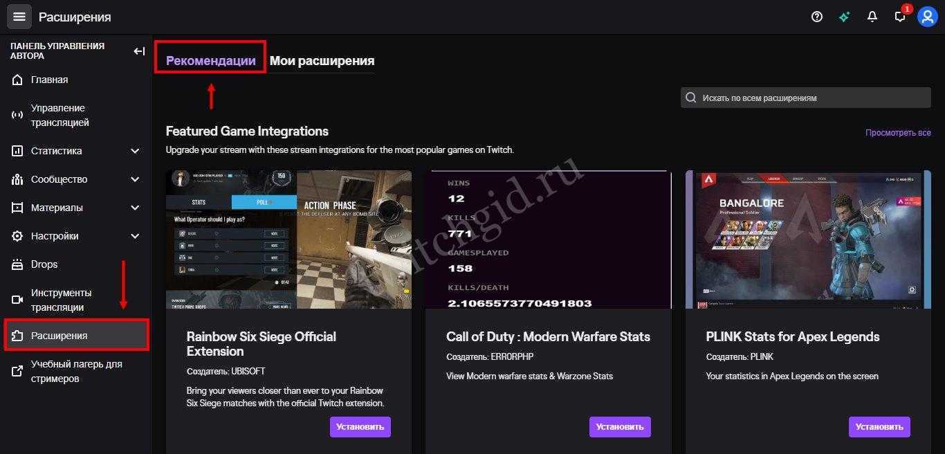 - На панели слева ищите раздел «Расширения для Twitch»;