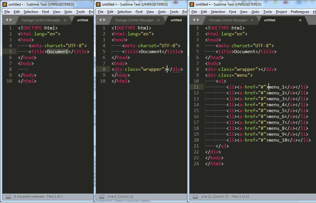 - Возможность использовать сниппеты для ускорения работы и большое количество плагинов для самых разных задач. Главным из них можно считать Package Control, с помощью которого можно искать и устанавливать необходимые плагины прямо из редактора.