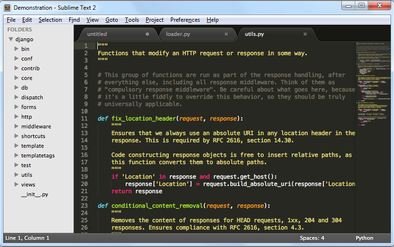 - Мощный Python API, благодаря которому Sublime обходит многих конкурентов. Он дает возможность достигать высокой производительности за счет дополнительных плагинов.