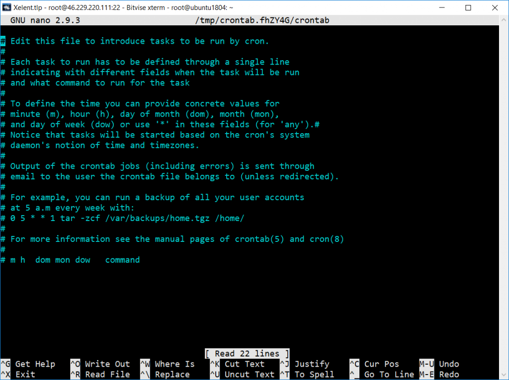 Рис. 5. При редактировании расписания (команда crontab -e) открылся nano. Настройка успешна