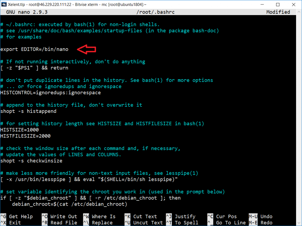 Вот только помните, что при следующем входе в систему переменная EDITOR будет установлена по умолчанию. Чтобы этого не произошло, нужно отредактировать файл.bashrc того пользователя, от имени которого будете редактировать конфигурационные файлы. В случае с root это будет файл /root/.bashrc:
