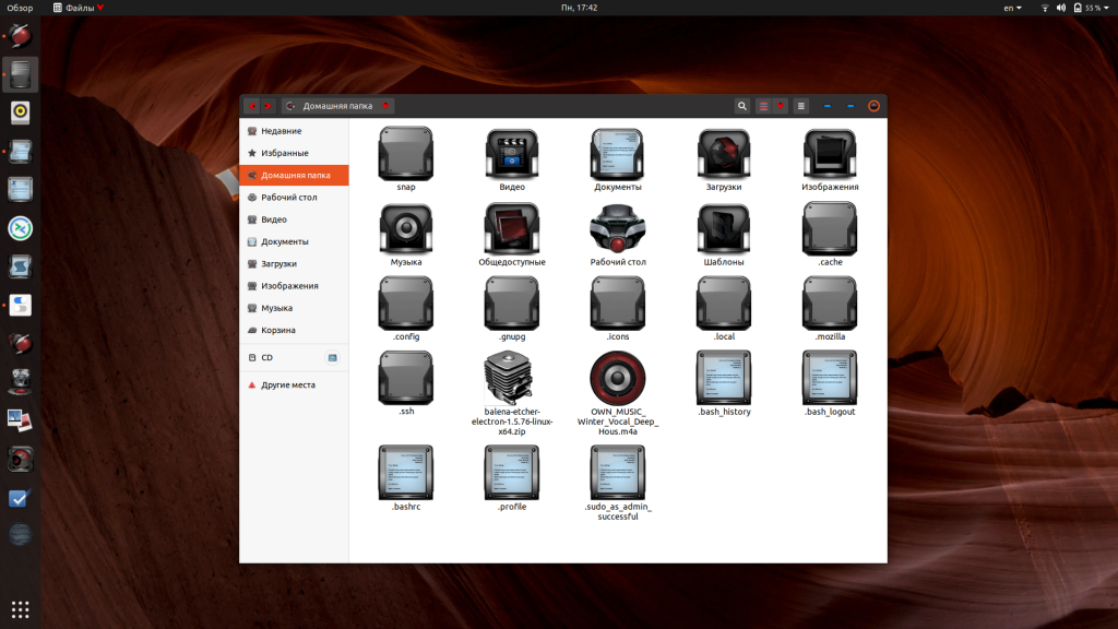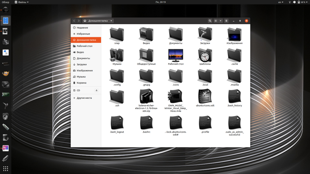 Она максимально возможно сглаживает пользовательский интерфейс. Приложения, меню и окна получают современный минималистичный внешний вид. Нотки прозрачности в элементах окон (а также в боковой панели Nautilus) помогают подчеркнуть легкость и воздушность темы.