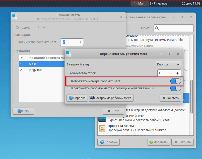В настройки Переключателя рабочих мест (переключателя виртуальных рабочих столов) добавлена новая опция для отображения номера рабочего места. Номер отображается перед названием рабочего места.