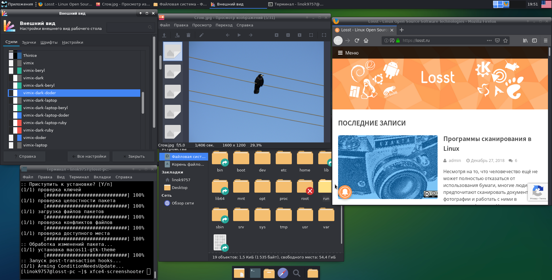 Наверное, одна из моих самых любимых тёмных тем оформления Xfce. Во многом похожа на Adapta, но, как по мне, немного лучше. К примеру, отчётливее виден контур кнопок, да и порой сочетание цветов удачнее, как в файловом менеджере: основное окно чуть более светлых оттенков, что, лично мне, нравится больше: