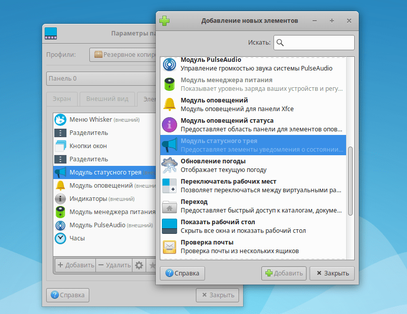 Для Панели добавлен новый плагин Status Tray (Модуль статусного трея), который совмещает в себе возможности плагинов systray и statusnotifier. Используется для отображения индикаторов приложений и области уведомлений.