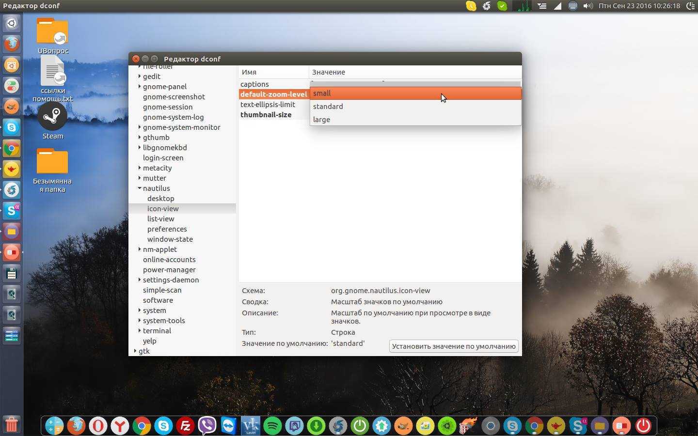 Наверное самый основной минус, это системные обновления. Недавно у меня был случай. вышло небольшое системное обновление, обновился еще наверное утром, до вечера работал не перезапускал компьютер, вечером выключил, на следующий день включил и был удивлен, Nautilus обновился до версии 3.18.5. Самым печальным было то, что все значки приложений / (ярлыки) стали огромными. Как всегда решил просто перейти в меню «Правка — Параметры» в домашней директории и в вкладке «Вид» изменить размер значков в системе, но не тут то было, вкладка «Правка» исчезла, вовсе навигационное меню исчезло. В крайнем случае я решил изменить размер иконок в редакторе Dconf, но увы и здесь оказалось это невозможным так как возможность выбора меньших размеров для значков рабочего стола отсутствовала, были лишь размеры(средний, большой и очень большой).