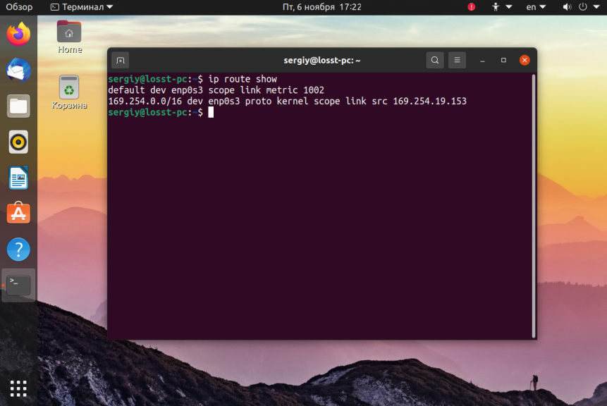 | 1 | # ip route add default via enp0s3 (маршрут через имя устройства) |