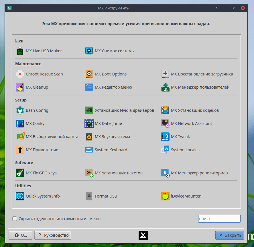 Также в состав MX Linux входит целый набор утилит, называемых MX Apps, написанных специально для данного дистрибутива. Многие MX Apps можно запускать через программу MX Tools, представляющую собой что-то вроде панели управления для настройки системы.