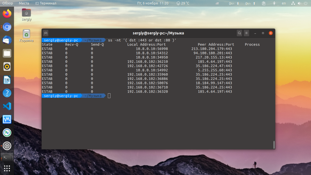 В синтаксисе команды мы описали два дополнительных параметра. Фильтрация состояния и фильтрация по адресу. Рассмотрим теперь как ими пользоваться. Сокет TCP может находиться в одном из нескольких состояний. Например, так утилита ss linux выведет только подключенные сокеты.