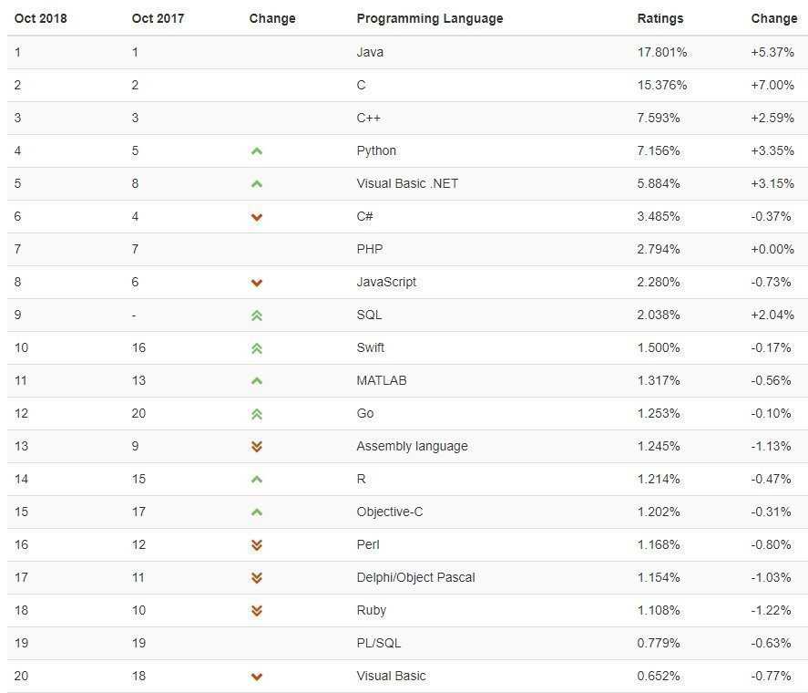 Топ TIOBE основывается на количестве поисковых запросов, обучающих курсов и специалистов. Здесь лидеры выглядят так: