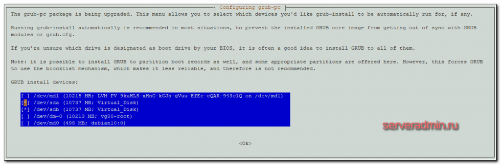 В итоге у вас должно получиться то же, что и у меня на картинке. Дальше ставите debian 10 как обычно. После установки на raid нужно выполнить несколько важных действий.