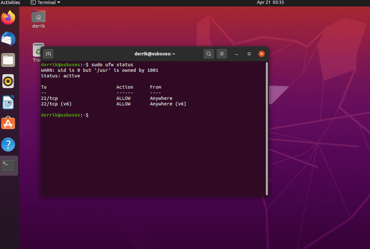 Убедившись, что межсетевой экран UFW работает, используйте ufw разрешить команда для перенаправления порта. Например, если вы размещаете сервер OpenSSH на своем ПК с Ubuntu, вам нужно будет открыть порт 22 для Интернета. Для этого вы можете ввести команду ниже.