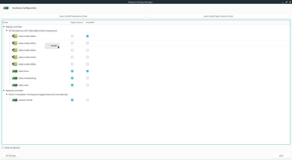 Во многих дистрибутивах установка драйвера Nvidia сделана неудобно, а в Manjaro нужно только нажать кнопку “Auto Install Proprietary Driver” и подождать.