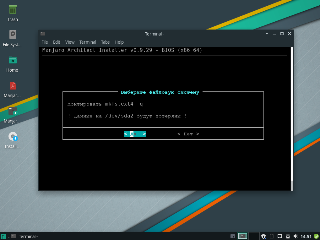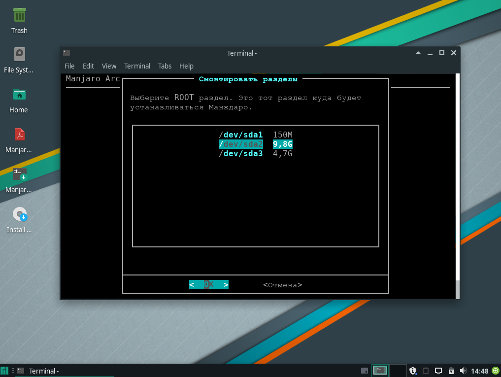 Мы будем использовать графический установщик Calamares, так как со своего опыта я могу судить, что он стабильнее чем Thus. Запускаем его.