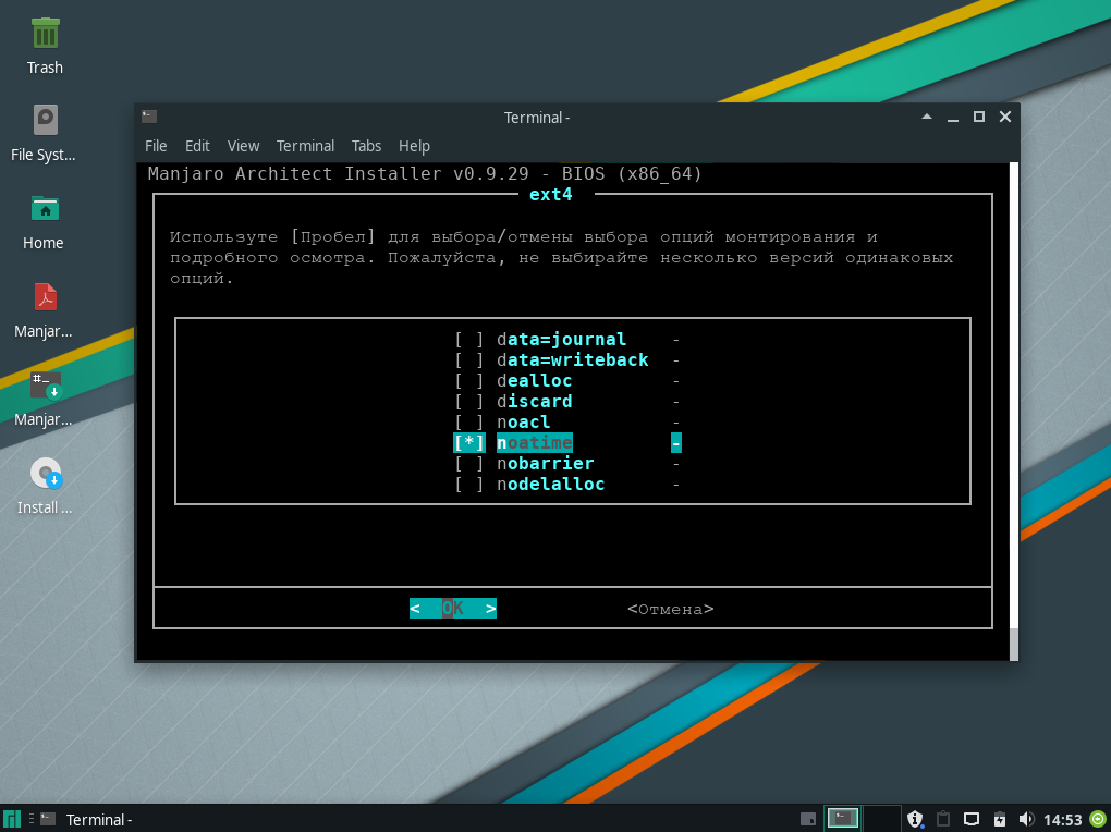 Точно так же отмечаем пункт noatime и нажимаем Enter: