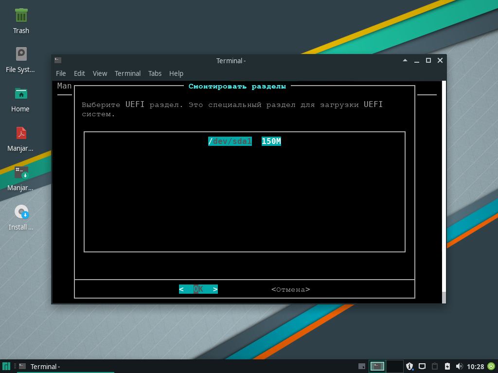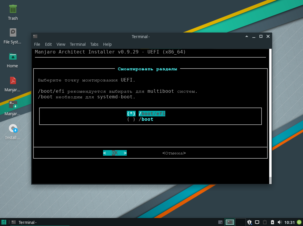 Нам нужен пункт /boot/efi, стрелочками передвигаемся до нужного нам раздела. Нажимаем пробел что бы его отметить если он у вас не отмечен и нажимаем Enter: