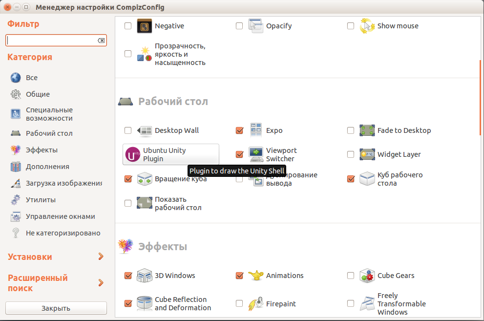 Раньше всего возможность более тонкой настройки появилась в менеджере конфигурации Compiz в виде плагина Unity Plugin. Настроек здесь не так уж много.
