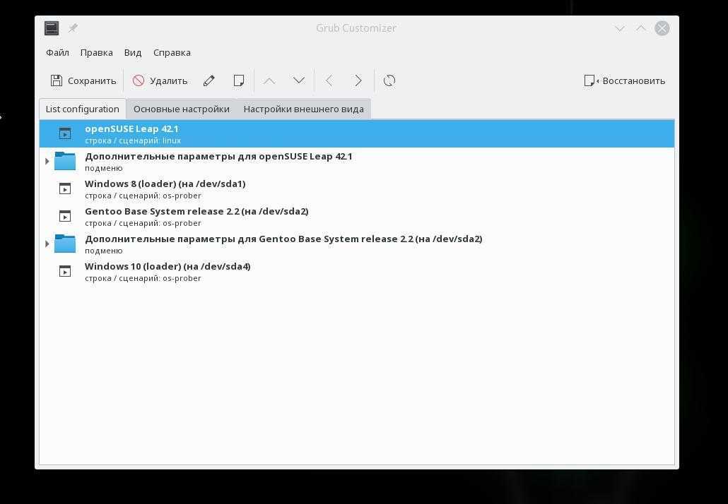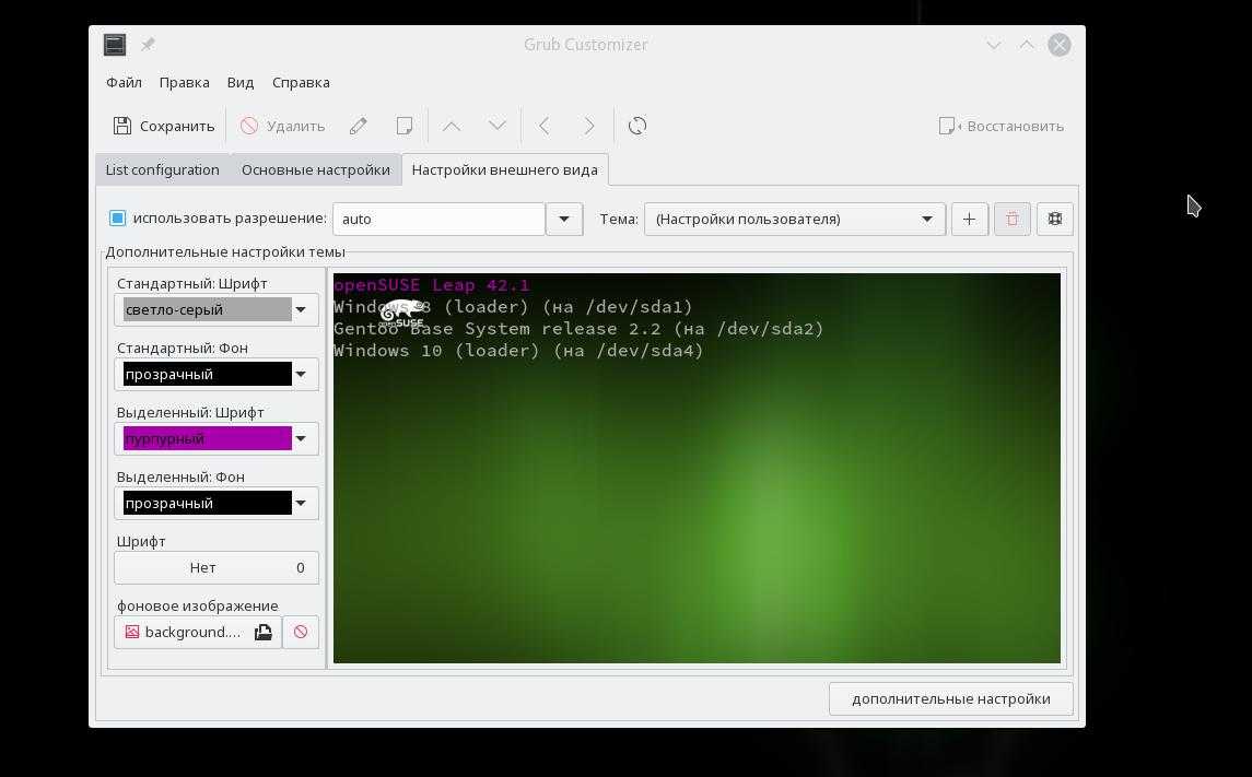 Это самый легкий путь конфигурации загрузчика. Графическая программа настройки Grub Customizer позволяет настроить все основные параметры загрузчика, например, фоновое изображение, шрифт, порядок пунктов загрузки, параметры ядра и многое другое. Все это делается в пару кликов.