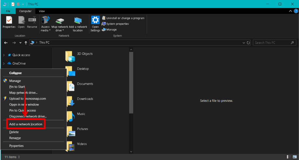 Запустите проводник в окне. На левой панели щелкните правой кнопкой мыши This PC . Затем выберите Добавить сетевое расположение из раскрывающихся меню.