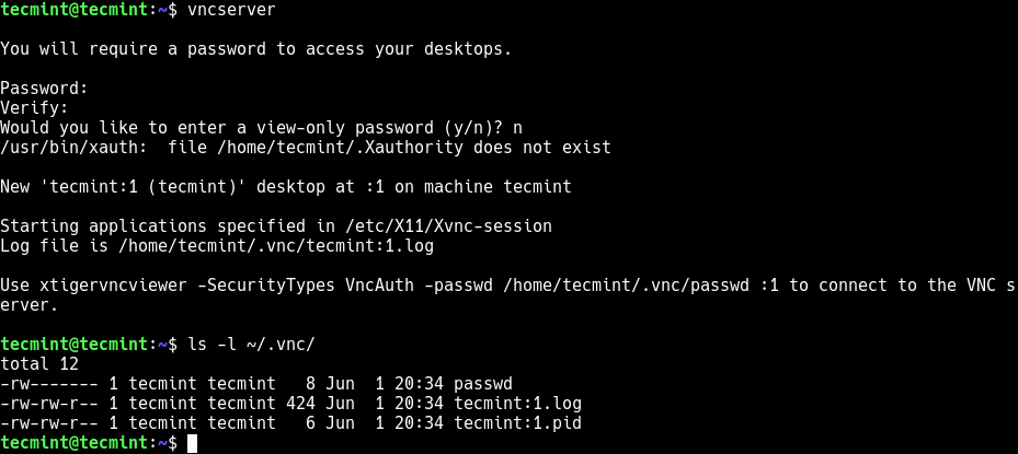 To complete the VNC server’s initial configuration after installation, use the command to set up a secure password and create the initial configuration files: