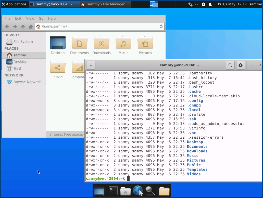 Введите ваш пароль (тот из 8 символов) который вы ввели при первом запуске VNC сервера. После этого откроется рабочий стол Xfce по умолчанию. Он будет выглядеть примерно следующим образом: