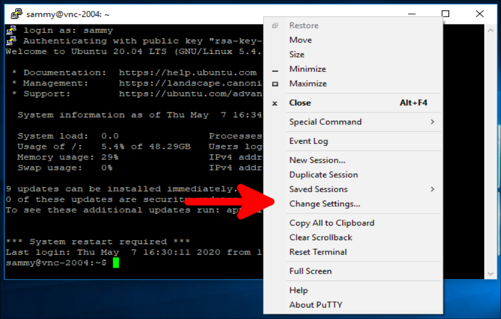 Если вы используете PuTTY для подключения к вашему серверу, вы можете создать туннель SSH, нажав правой кнопкой мыши на верхнюю панель окна терминала, а затем выбрав опцию Change Settings…: