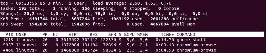 Если мы хотим получить снимок того, что в данный момент происходит в системе, нужно использовать программу top.