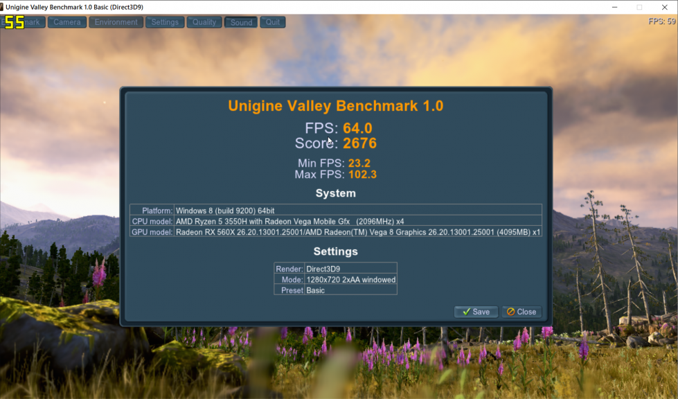 Далее я запустил тест Valley, но уже на Windows 10 (на скрине Windows 8, не знаю почему бенчмарк определяет 10 как 8).