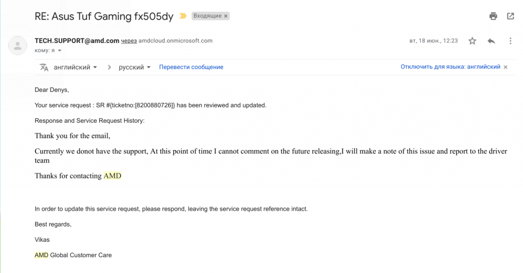 Примерный перевод таков: «Спасибо за обращение, в данный момент мы не поддерживаем, я не могу ничего сказать про следующие выпуски. Я отмечу данный запрос и передам его команде, которая занимается разработкой драйверов.»