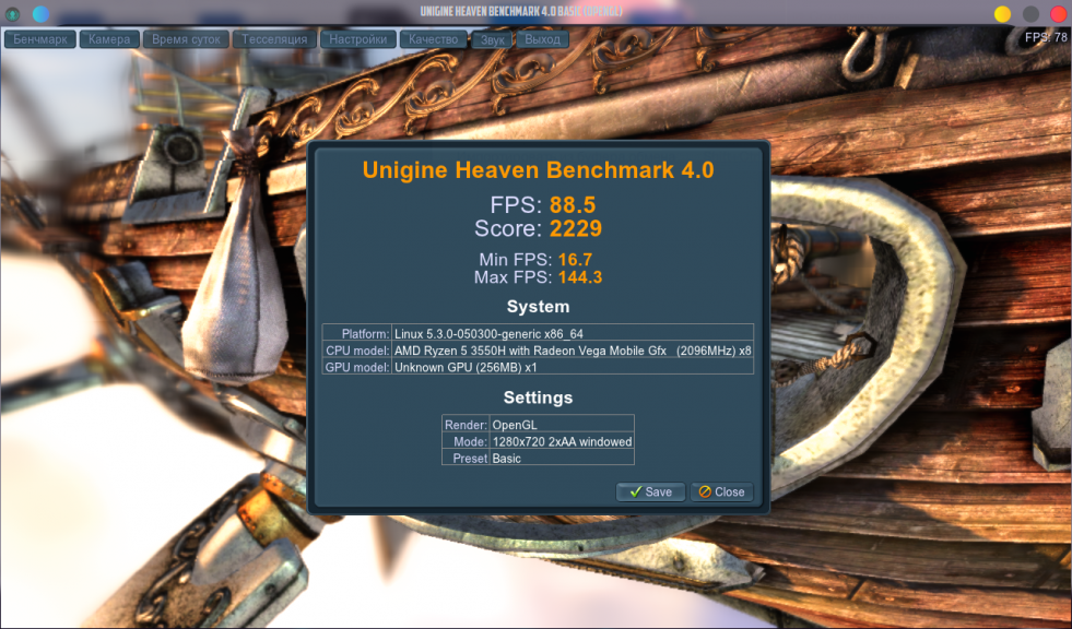 Здесь уже, куда лучше. Да так лучше чем на Windows 10 с их заточенными драйверами и фирменными утилитами. По среднему fps, получем неплохой прирост. У меня не сохранились скрины всех тестов, поэтому привожу то, что есть, но поверьте, в данном тесте, если сравнивать Ubuntu 19.04 и Windows 10, лучший показатель будет на Linux дистрибутиве.
