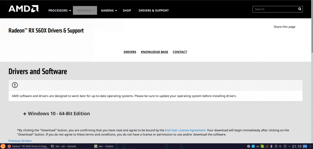 Несмотря на то, что на официальном сайте AMD поддержка для данной карточки заявлена только для Windows 10, я решил написать в тех. поддержку и спросил про планы выпуска драйверов для Linux систем. На что получил вот такой ответ: