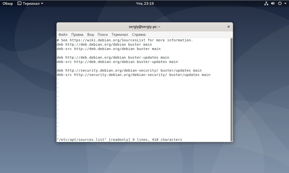Затем откройте файл для редактирования, с помощью vim или apt edit sources и замените все вхождения слова stretch на buster: