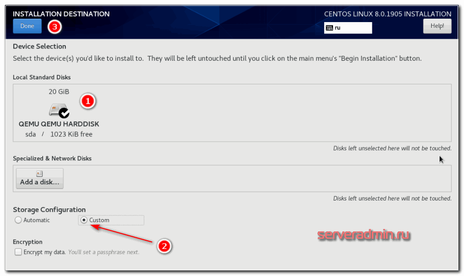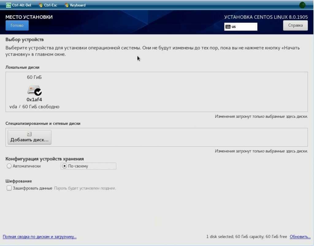 Теперь рассмотрим наиболее сложный вариант установки. Мы будем ставить CentOS 7 на программный рейд. Для примера возьмем 2 диска и raid 1. Все установки будут такие же, как мы рассмотрели ранее, кроме одной — INSTALLATION DESTINATION.