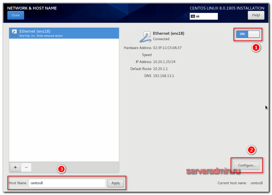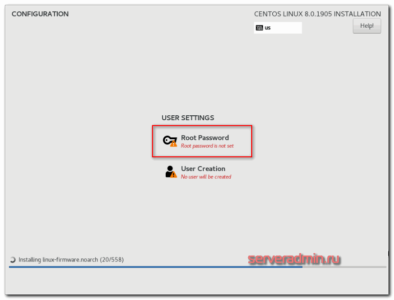 В процессе установки вы можете установить пароль для пользователя root и создать дополнительного пользователя с административными правами или без них. Нажмите на кнопку «Root Password»:
