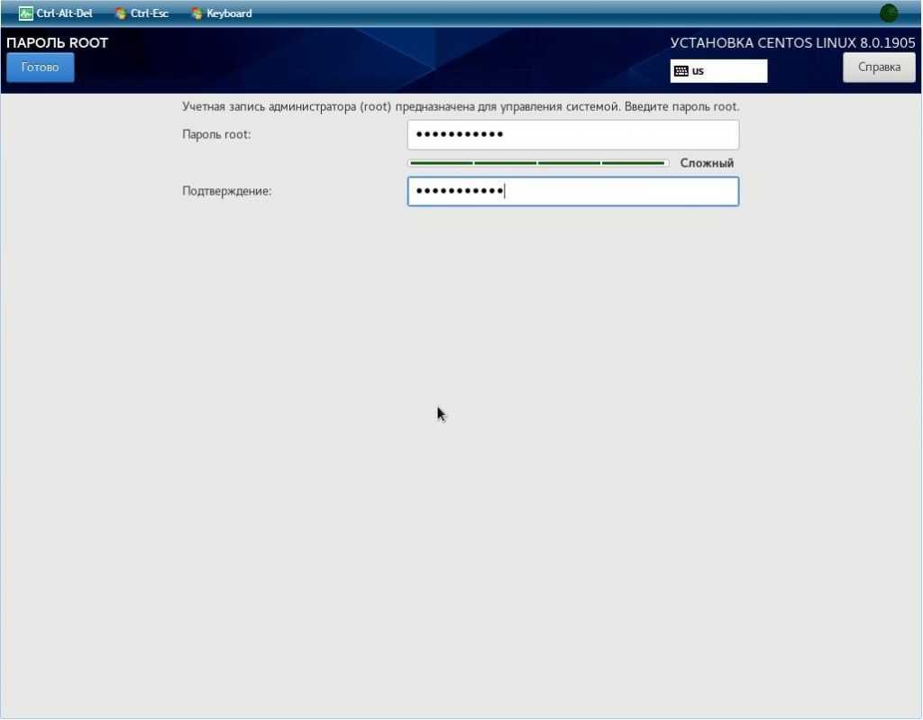 Введите пароль в поле «Пароль root» и повторите этот же пароль в поле «Подтверждение». Нажмите на кнопку «Готово»: