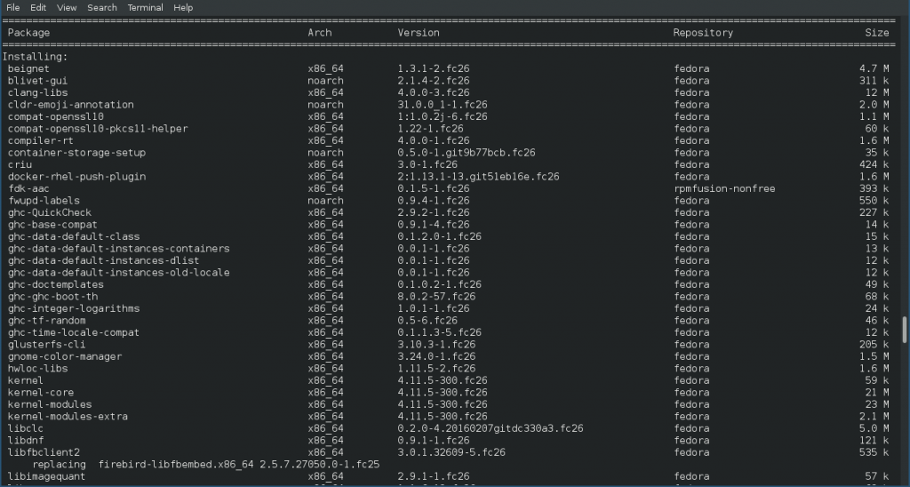 Обновление Fedora 25 до 26 с помощью командной строки не сильно отличается от обычного обновления. Нам предстоит выполнить все те же операции, только все нужно выполнять в терминале и вы получите намного больше информации о процессе обновления.