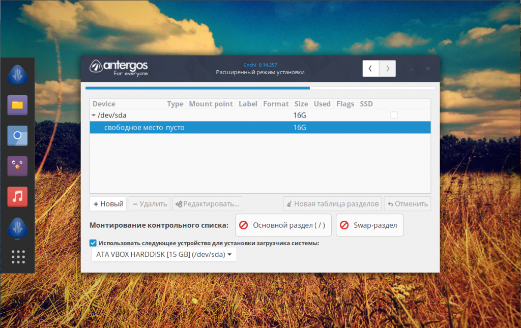 Разметка диска и выбор точек монтирования проходит в два этапа. Сначала в программе cfdisk создаются разделы диска, затем указываются точки монтирования. Создание разделов диска