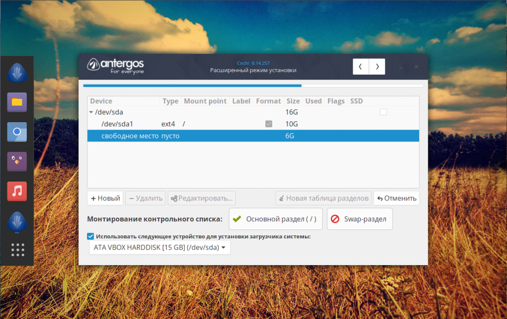 Затем выберите размер не менее 10 Гб и точку монтирования «/». Файловую систему оставьте по умолчанию ext4, а метку вообще можно не задавать.