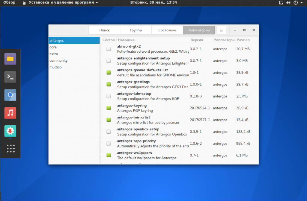 Вы получаете Gnome 3 с настройками почти по умолчанию. Из улучшений можно отметить тему и квадратные иконки. Также дистрибутив содержит пакетный менеджер pamc, который представляет из себя графический интерфейс для pacman: