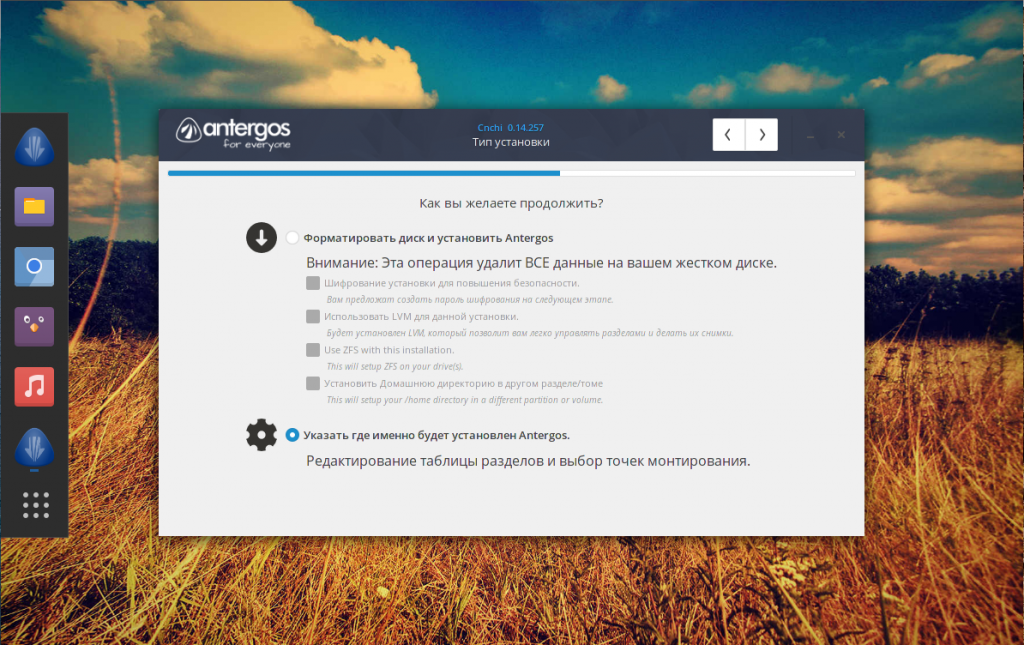Дальше нам нужно разметить диск, вы можете позволить установщику сделать это автоматически, но в этой статье мы рассмотрим ручную разметку, поэтому выберите «Указать где именно будет установлен Antergos»: