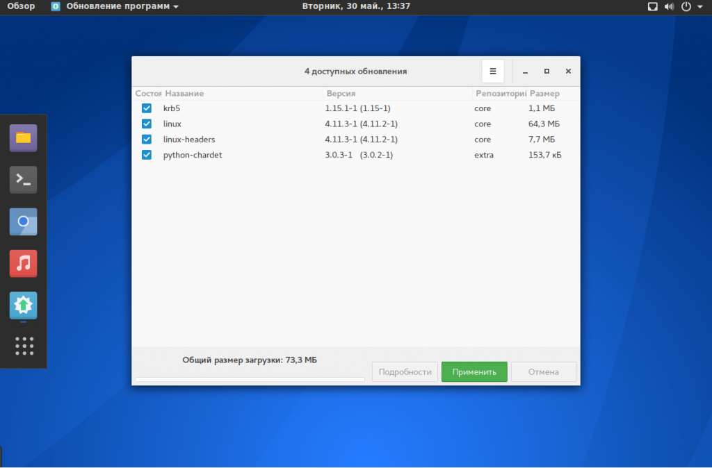 Обновления программ выходят в так называемом плавающем релизе (rolling-release). То есть, как только появляется новая версия какой-либо программы, то вы тут же можете ее установить, а не ждать, когда выйдет глобальное обновление системы.