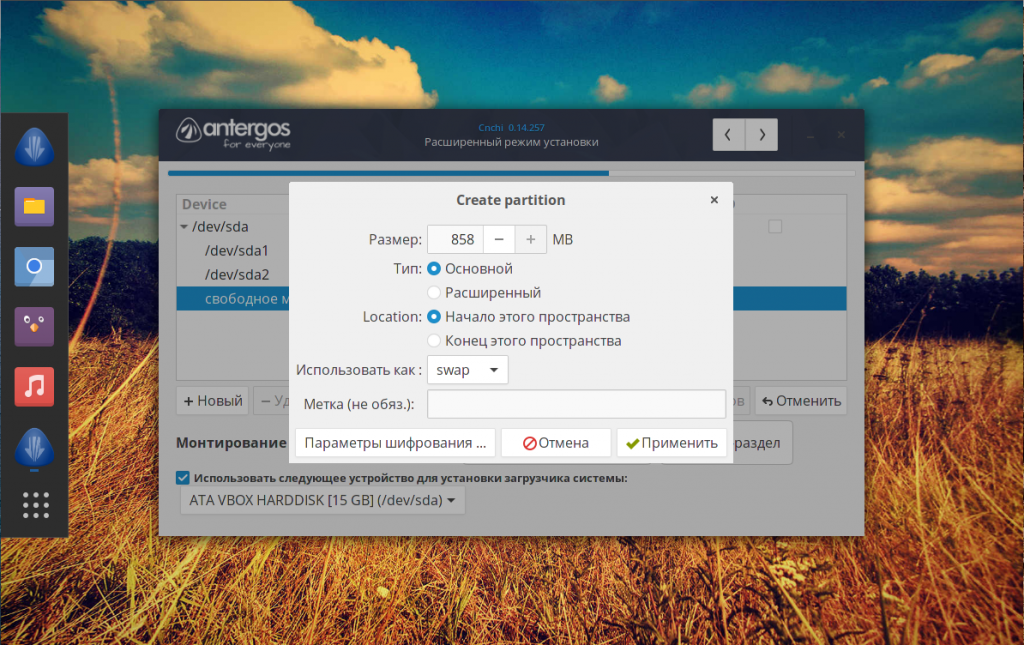 - Загрузчик (выбор диска для установки загрузчика GRUB2)