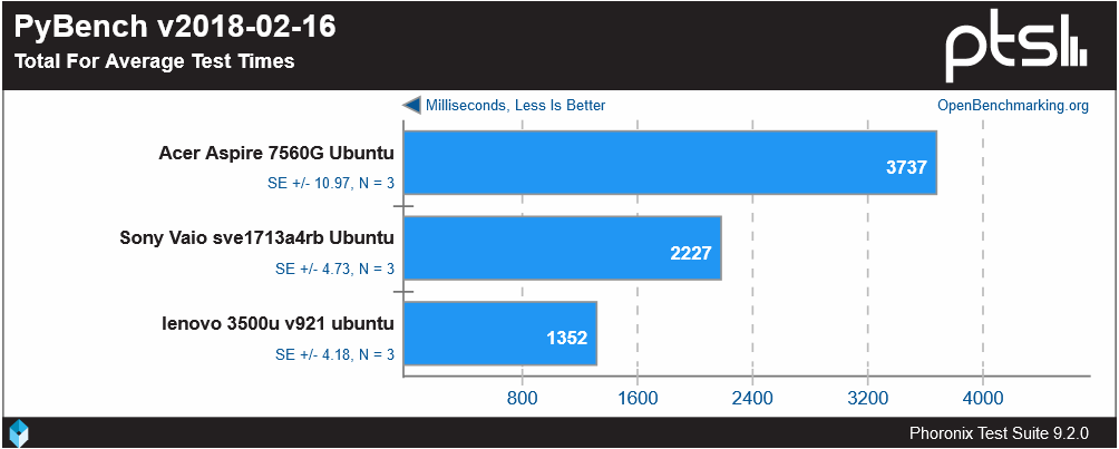 Этот тест сообщает суммарное время усредненных результатов прохождения тестов Pybench. Pybench сообщает среднее время выполнения функций Python, что дает довольно точную оценку производительности в данном языке программирования.