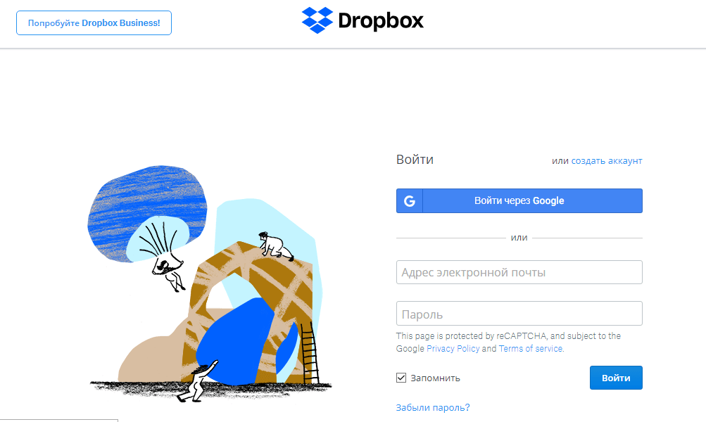 У Дропбокс на главной странице два призыва к действию – войти или попробовать решение для бизнеса.