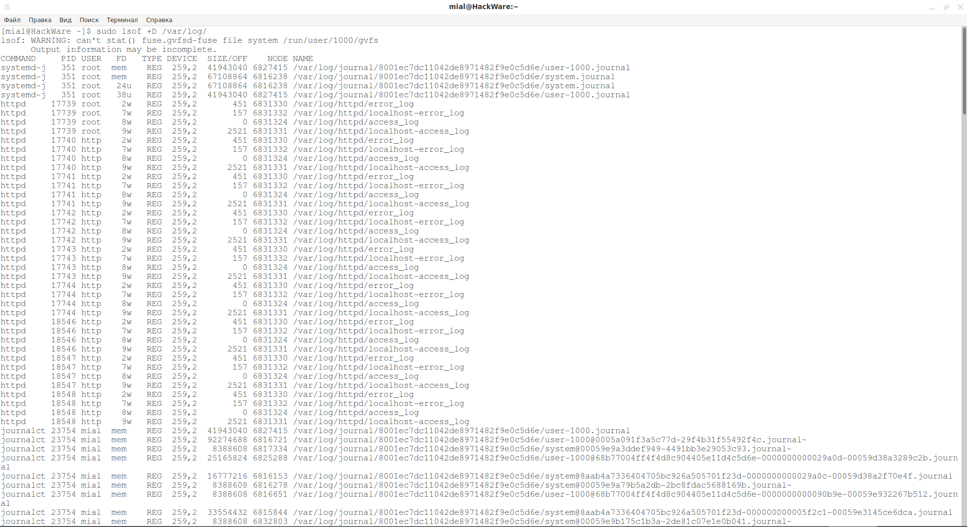 До появления вывода lsof, пользователи могут увидеть предупреждающее сообщение в окне терминала.