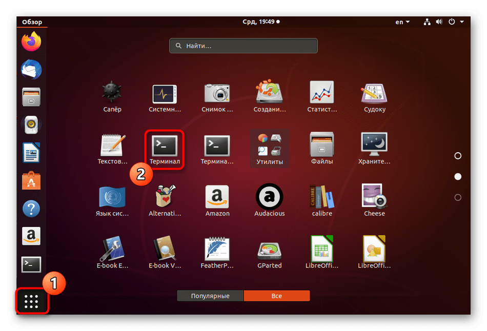 - Все начинается с запуска «Терминала». Сделать это можно, например, через меню приложений, кликнув левой кнопкой мыши по соответствующему значку.