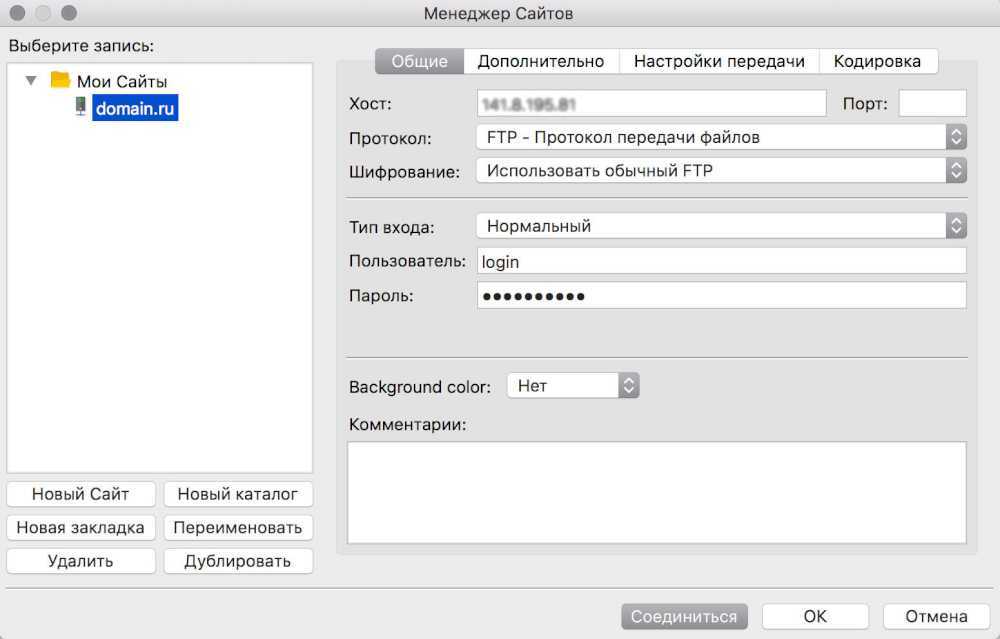 Выберите тип входа «Нормальный» и укажите имя пользователя. Если вы используете основной аккаунт FTP, это имя совпадает с логином в Панели управления. В примере на скриншоте ниже был создан дополнительный пользователь user1 для сайта domain.ru, его имя выглядит как user1@domain.ru.