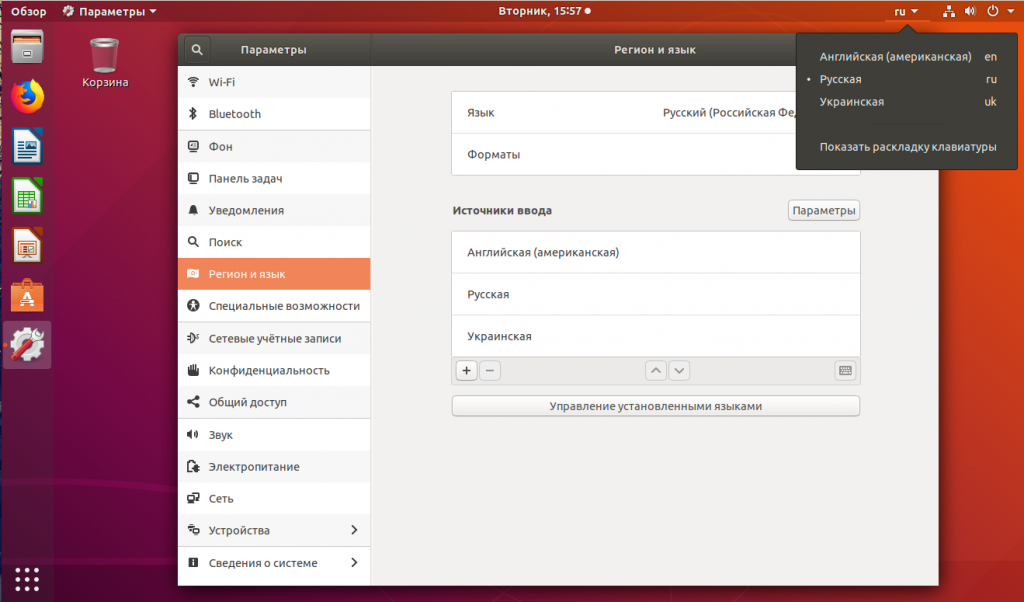 Все эти сочетания клавиш перекочевали в Linux, и сейчас смена раскладки клавиатуры Ubuntu 18.04 может быть выполнена такими способами: